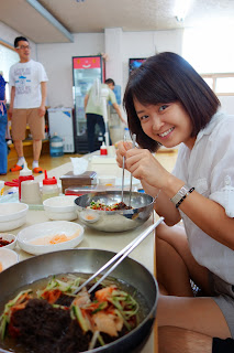 After looking around the hall, Jihyeons parents took us out for lunch to a famous cold noodle place in the old downtown area of Iksan. In Korea it is normal to see a set of scissors on the table. These are used instead of a knife to cut the food your are eating, be it vegetables, meat or noodles.